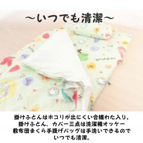 商品情報セット内容掛け布団・掛けカバー敷布団・敷きカバー枕・枕カバー・手提げバッグキャラクターミッキー・カーズ・ディズニープリンセス組成【掛け布団】サイズ:79×109cm 約440g側生地:ポリエステル100%中綿:ポリエステル100%【掛けカバー】サイズ:80×110cm ポリエステル100%【敷布団】サイズ:67×120cm 約750g側生地:ポリエステル100%中綿:ポリエステル100%【敷きカバー】サイズ:69×122cm ポリエステル100%【まくら】サイズ:23×35cm 約90g側生地:ポリエステル100%中綿:ポリエステル100%【枕カバー】サイズ:26×38cm ポリエステル100%【手提げバッグ】サイズ:42×70×14cm 約230g側生地:ポリエステル100%生産国中国製注意事項※カバー類は布団・まくらにセットされた状態でお届けします。